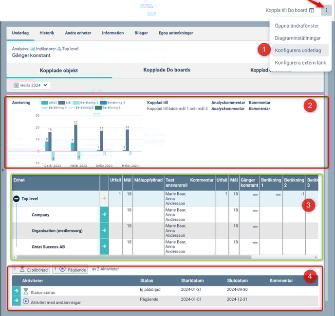 Konfigurera analysvyerna för att få bästa möjliga underlag när ni följer upp mål, mått och aktiviteter.