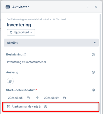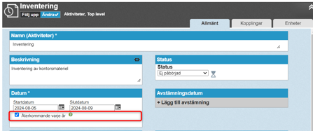 Om er organisation har aktiviteter som återkommer varje år så kan ni använda funktionen "Återkommande varje år". Aktiveten återanvänds då nästa och kommande år, och får sina start- och slutdatum förskjutna med ett kalenderår vid versionshanteringen.