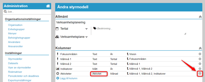 Gå till Styrmodeller i administrationen och klicka på skiftnyckeln för styrmodellen. Klicka sedan på kugghjulet för den aktivitetskolumn du vill aktivera funktionen för.