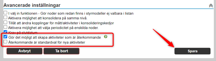 Expandera sektionen "Avancerade inställningar" längst ner, och kryssa i "Gör det möjligt att skapa aktiviteter som är återkommande".