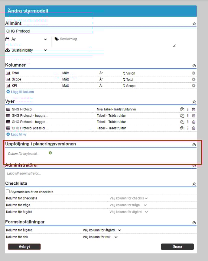 Det går att ställa in om en styrmodell ska ha ett eget startdatum för när planeringen ska börja gälla. Påverkar idag endast todo-listan och påminnelser. Påverkar ej t.ex. vilken period som räknas som den första i en vy/rapportdel i planeringen eller andra inställningar som utgår ifrån planeringsversionens startdatum.