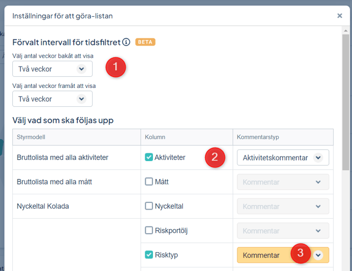 2) Välj sedan vilka styrmodellskolumner som skall generera påminnelser/kort i att-göra-listan för de ansvarsroller som finns för kolumnen
