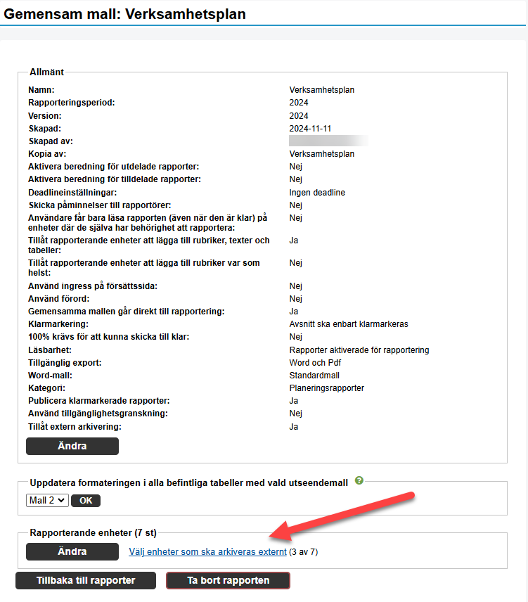- Gå till rapporten som ska markeras för extern arkivering och sedan till "Inställningar" och klicka på "Ändra" under rubriken Allmänt, där hittar ni inställningen "Tillåt extern arkivering" och har möjlighet att aktivera den för varje rapportmall som ska vara tillgänglig för e-arkivering.
