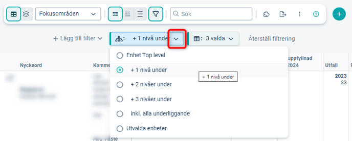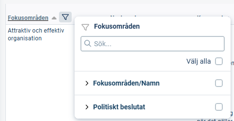 Klicka på "pil ner" på ett befintligt filter för att fälla ut det. Gör den justering du önskar. Arbetsytan filtrerar om sig direkt. Du ändrar bara filtreringen för din egen användare.