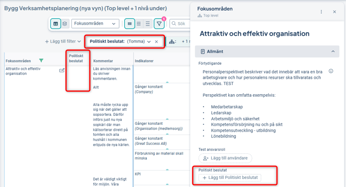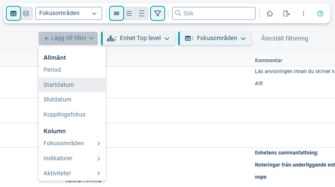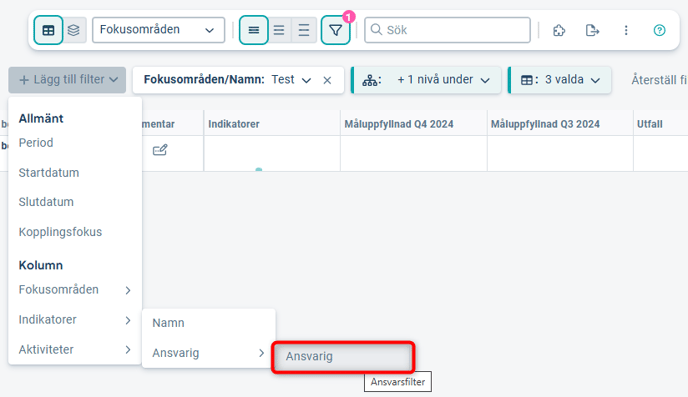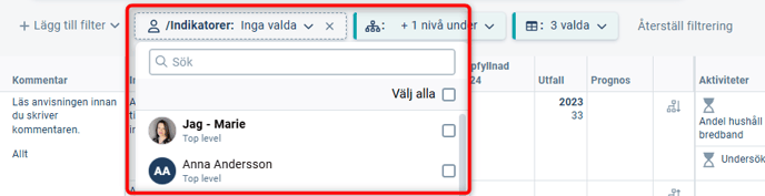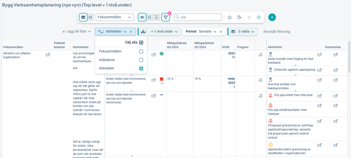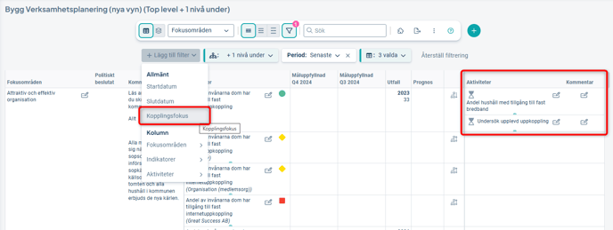 Om filtret Kopplingsfokus är aktiverat kan du ställa in att bara se rader som har en koppling till en viss objektstyp. Om du till exempel endast önskar se de indikatorer som har en aktivitet kopplad till sig, lägger du till filtret kopplingsfokus: