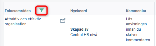 När du har ett aktivt filter för en viss kolumn visas detta med en turkos filtertratt i kolumnrubriken.