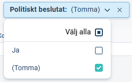 För nyckelordsfilter finns ett val att visa "tomma". Detta filterar fram objekt som inte har detta nyckelord satt. Detta kan vara bra att använda om du vill säkerställa att alla objekt har ett värde för ett visst nyckelord, eller vill se vilka objekt som saknar nyckelordet a andra skäl.