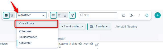 Om du har återställt din filtrering, men ändå upplever att du inte ser förväntad data kan det bero på att arbetsytan har en gruppering. Byt i så fall till önskad gruppering eller välj Visa alla data.