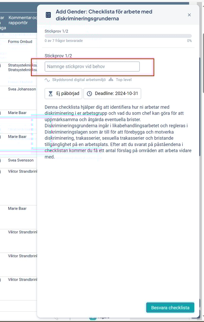 För checklistor som är av typen stickprov, kan man skriva in vart man var när man besvarade checklistan t.ex. matsal, gymnastikhall, osv.