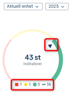 - Under mätaren visas hur många mått som finns med en viss färg för de ingående måtten. Grått avser att färg saknas. I bilden nedan är 5 av 7 mått med färg gröna, vilket gör att pilen lutar mot grönt.