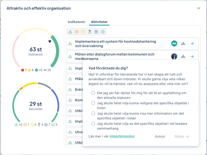 När du klickar på pilen visas just nu en minienkät då vi för närvarande vill ta in bred feedback kring om/hur användarna önskar fördjupa sig vidare, där vi vill uppmuntra till att besvara enkäten.