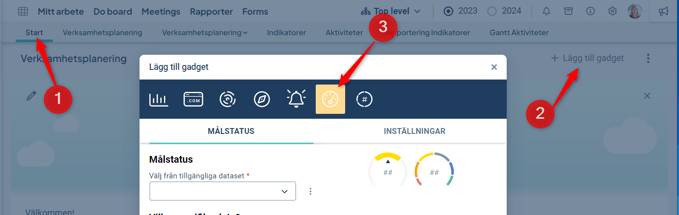 Från din dashboard (1), klicka på Lägg till gadget (2) och välj Målstatus (3):