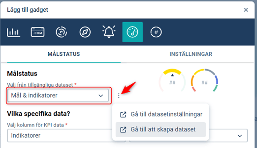 - Ett underliggande dataurvalet (dataset) behöver skapas för att kunna lägga till gadgeten på dashboards. Fullständiga administratörer kan skapa dataset. Läs mer här: Dataset.