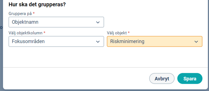 Välj att gruppera på objektnamn samt vilken kolumn och objekt (nod) du vill gruppera informationen på: