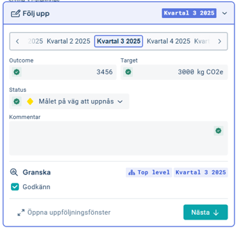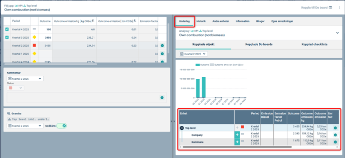 När du godkänner rapporterad data på ett mått som har underliggande nivåer godkänns även dessa automatiskt. Du kan granska underliggande enheters data i uppföljningsfönstrets underlag som du hittar till höger i uppföljningsfönstret.