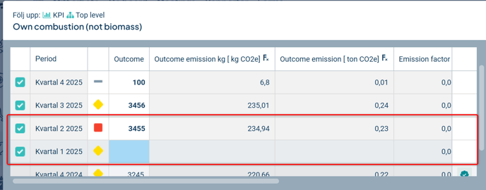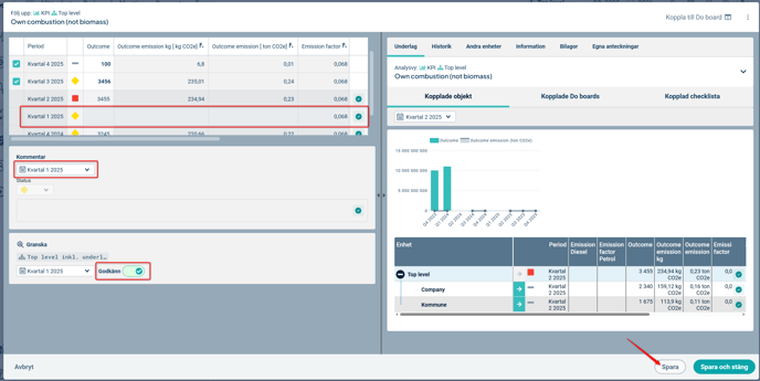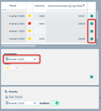 2) Ta bort godkännandet för det/de mått du vill ändra data för i de kopplade måtten till höger. Uppdatera data, godkänn perioden och spara. Kontrollera att måtten till vänster uppdateras med dina ändringar.