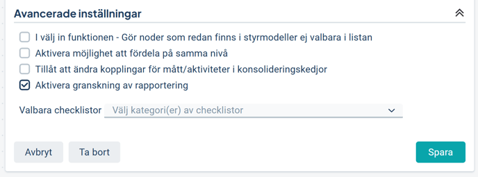 Aktiver funktionen i inställningarna för styrmodellen. Där kan du styra vilka styrmodellskolumner som skall gå att granska och godkänna i styrmodellskolumnens avancerade inställningar. Kryssa då i "Aktivera granskning av rapportering".