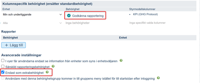 När funktionen är aktiverad, visas ett till alternativ i behörighetsinställningarna som heter "Godkänna rapportering".