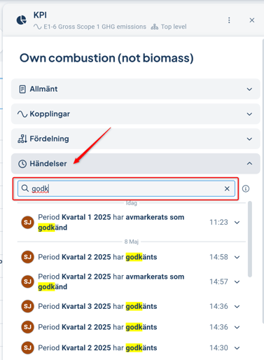 I objektsfönstret avdelning "Händelser" får du information om vem som har godkänt data och när. Du kan söka efter specifik historik i sökfältet.