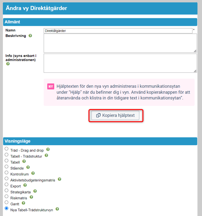 Notera att du själv behöver klistra in den kopierade hjälptexten i den nya vyn.