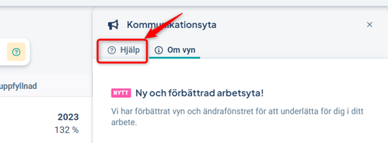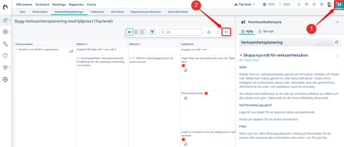 I nya vytypen hittar du hjälptexten som hör till vyn i kommunikationsytan. Du öppnar den genom att klicka på megafonen (1) eller på frågetecknet (2) i vyns verktygsfält.