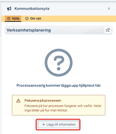 Om du endast möts av budskapet "Processansvarig kommer lägga upp hjälptext här" utan knapp för att lägga till information, så har du inte behörighet att själv ändra hjälptexten.