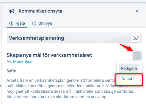 Om du redan har en hjälptext som du helt vill ta bort, klicka på kontextmenyn (tre prickar) och sedan på Ta bort. Bekräfta sedan borttagandet i popup-dialogen.