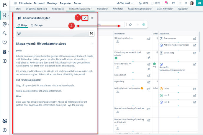 Användarna kan minimera och expandera ytan (1) och flytta hjälptexten i vyn (2) för att få bättre stöd för arbetet i vyn.