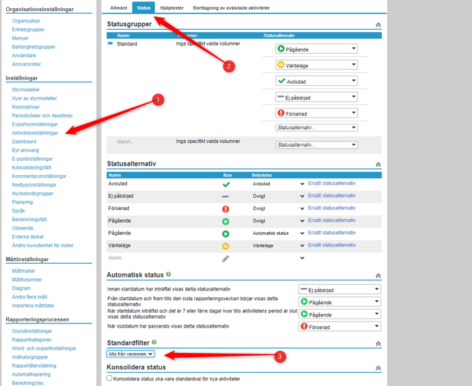 I administrationnsmenyn Aktivitetsinställningar ställer du in standardfiltret för samtliga aktiviteter i Stratsys. Detta påverkar hur aktiviteter filtreras i vyer och rapportdelar.