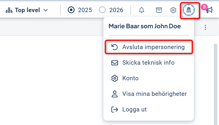 Avsluta impersoneringen görs genom att klicka på symbolen och välja "Avsluta impersonering".