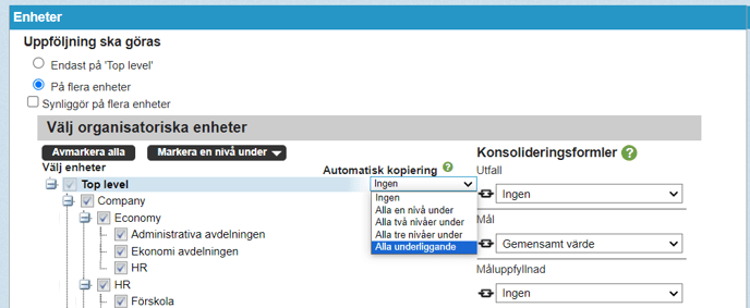 Välj från vilken nivå du vill ha automatisk kopiering och hur många nivåer ner du vill att den skall ske. Om du vill att samtliga nya enheter skall få måttet/aktiviteten, välj då "Alla underliggande" från måttets översta nivå.