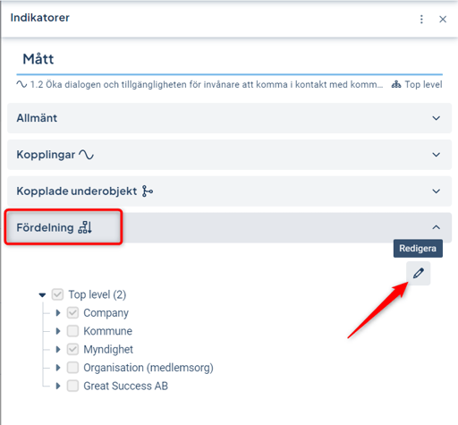 Öppna objektfönstret från översta enheten för ditt mått, aktivitet eller text och expandera sektionen Fördelning. Klicka på pennan i övre högra hörnet för att redigera enhetsfördelningen.
