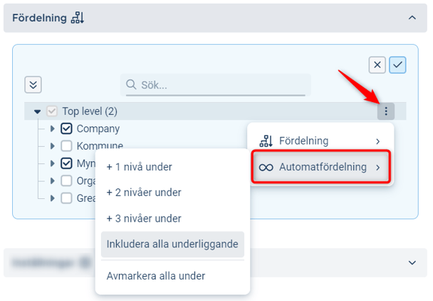 Klicka på kontextmenyn (tre prickar) för den enhetsnivå du vill ställa in automatisk fördelning för. Välj "Automatfördelning" och välj hur många underliggande nivåer som fördelningen skall nå.