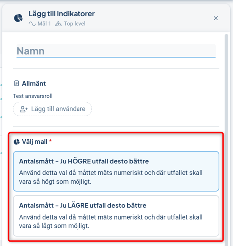 I objektfönstret visas avsnittet "Välj mall" under sektionen "Allmänt". Fundera på vad måttet avser att mäta, och välj den mest lämpliga mallen utifrån mallarnas namn och beskrivning.