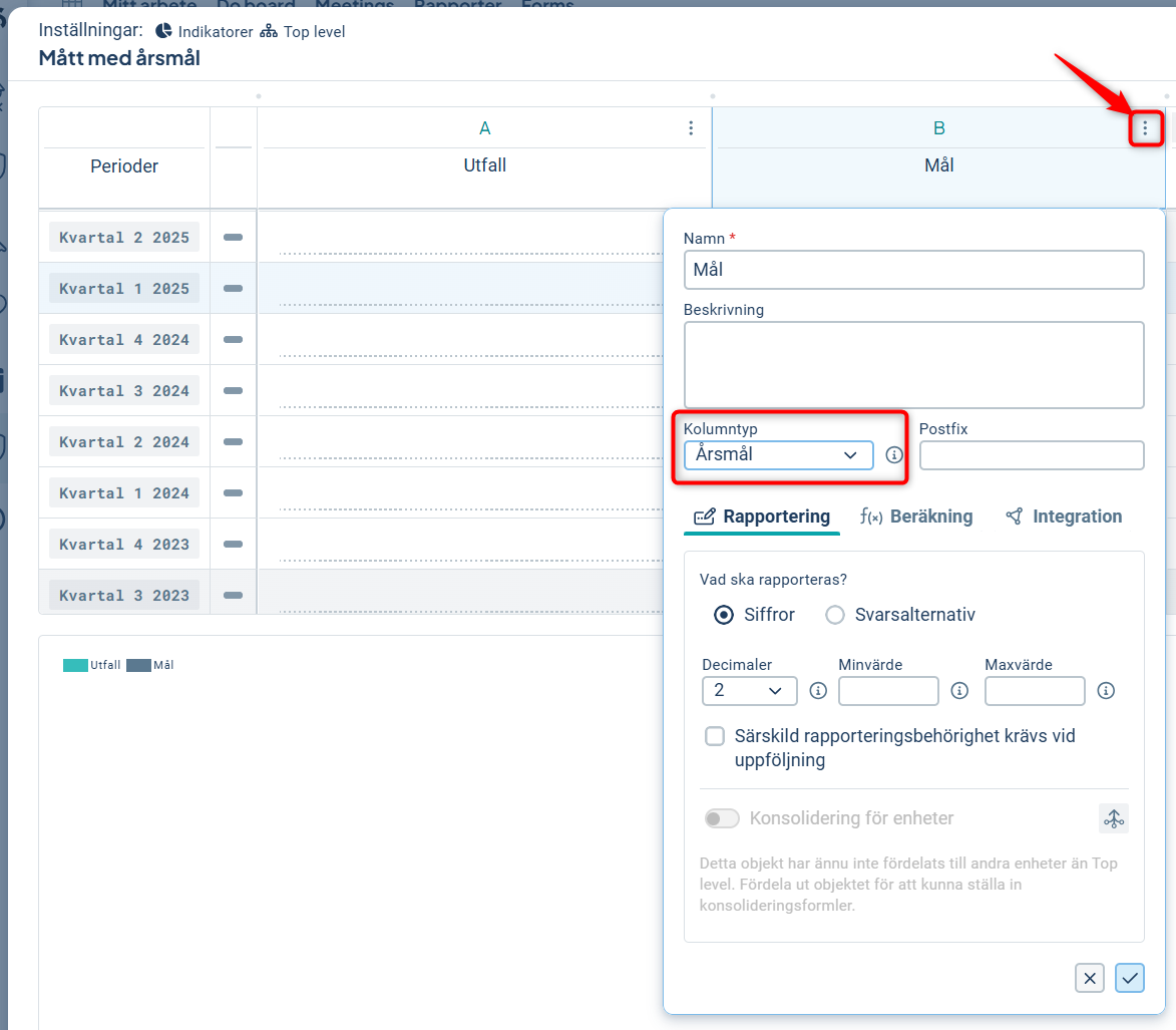 Om du har en datakolumn där ett värde endast kommer rapporteras in en gång per år, men måttet själv har en kortare periodicitet, kan du ställa in denna kolumnen som typen Årsmål.