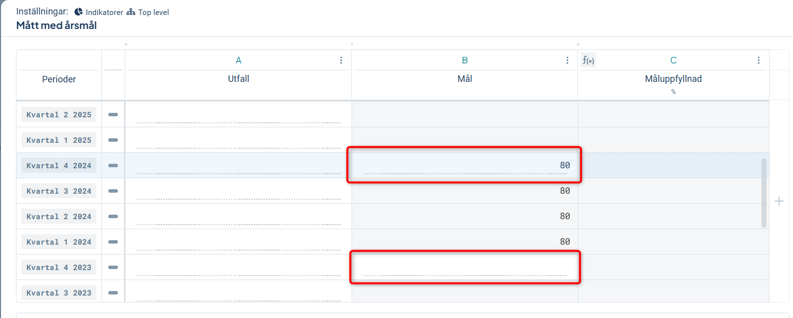 Med denna inställning kommer andra perioder inom måttets periodicitet att gråmarkeras och endast sista perioden kommer gå att sätta ett värde för. Du ställer in årsmål i måttdatakolumnens inställningar genom att välja det i fältet Kolumntyp.