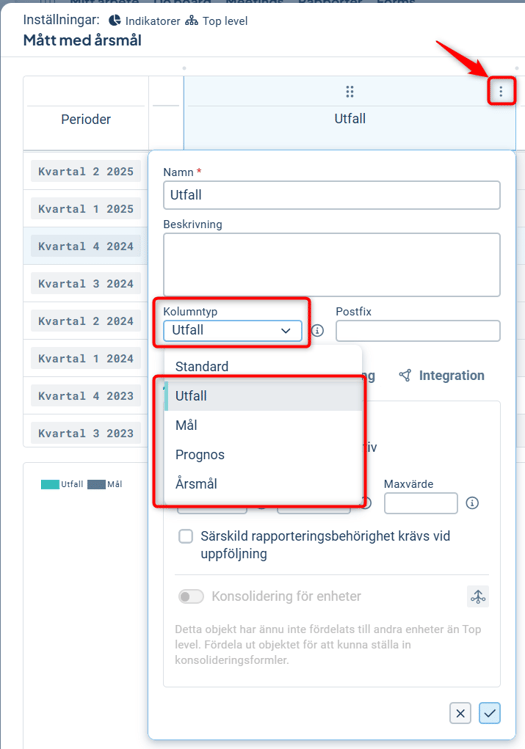 Motsvarande kolumntyper återfinns i måttdatakolumnernas inställningar. Den som är ansvarig för att rapportera utfall, kommer alltså att bli påmind om att rapportera i kolumner med typen "Utfall" i måtten de är ansvariga för. Namnet på måttdatakolumnen spelar alltså ingen roll för detta.