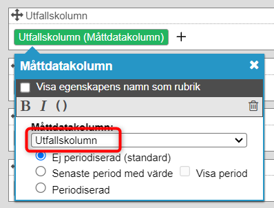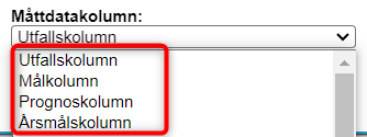 Det kan vara svårt att se skillnad när man väljer nodegenskap, men egenskaperna heter Utfallskolumn, Målkolumn, Prognoskolumn och Årsmålskolumn och ligger alltid samlade överst i listan av de måttdatakolumner som går att välja.