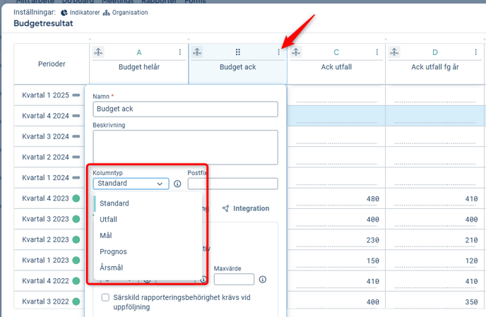 Om kolumnen har typen Årsmål går det endast att skriva in ett målvärde i den sista perioden för året, som då gäller samtliga perioder. Kolumntypen är bara relevant om måttet har en tätare periodicitet än "År", exempelvis Tertial eller Kvartal.