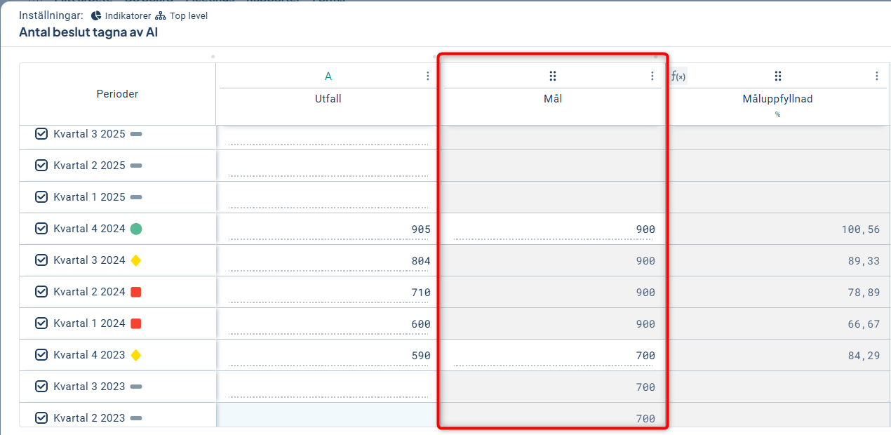 Här ser vi att för för "Utfall" kan vi ange data per kvartal, men för kolumnen "Mål" kan vi endast skriva rapportera i årets sista period, som sedan gäller för hela året (de gråmarkerade perioderna).