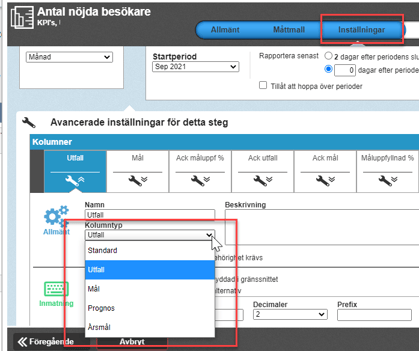 Egenskapen "Kolumntyp" kan styra hur visning sker i vyer, hur ansvariga påminns om rapportering, samt hur ofta data skall rapporteras.