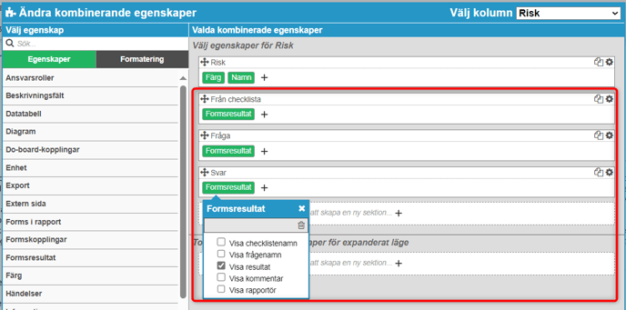 För att få en rubriksättning och formatering kan du dela upp egenskaperna i flera sektioner, exempelvis som för risken nedan: