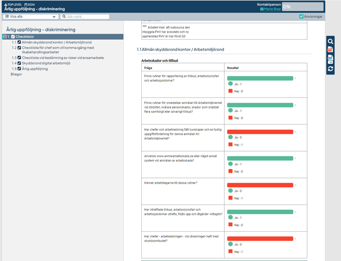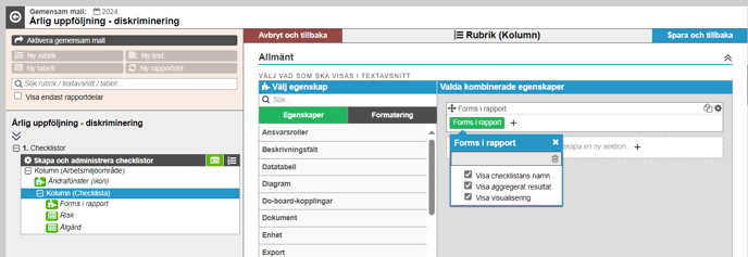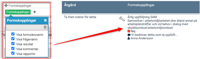 I både vyer och i rapportdelar kan man åskådliggöra att de åtgärder och risker som skapas i samband med att frågorna besvaras har sitt ursprung i en checklista.