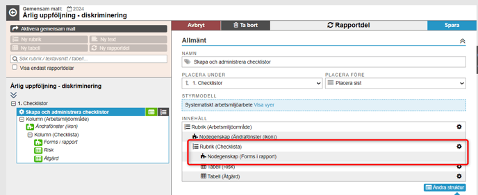 För rapporter finns en egen nodegenskap, "Forms i rapport", som du kan använda i rapportdelar.