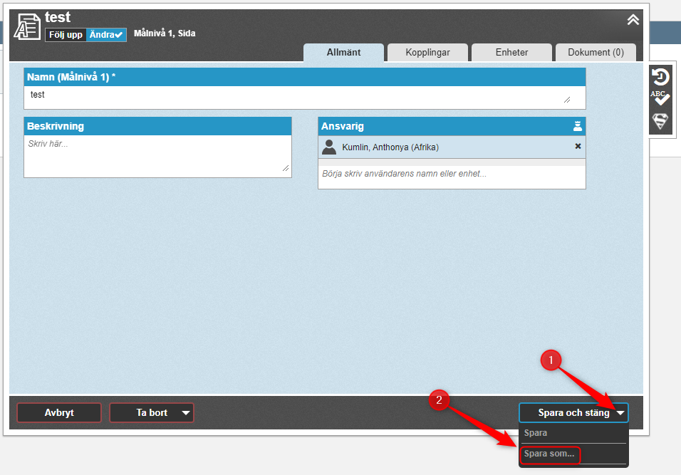Klicka på "Spara som" och välj sedan ett namn på kopian. En ny nod har nu sparats med samma inställningar som originalet. Allt kopieras förutom namn, ansvariga för de aktuella ansvarsrollerna, dokument och inrapporterade värden eller kommentarer.