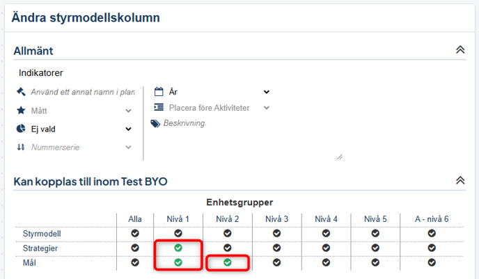 I fallet ovan kan alltså indikatorer kopplas mot Mål och Strategier om du står på en enhet som hör till enhetsgrupp "Nivå 1"; men bara mot Mål om du befinner dig på "Nivå 2" i organisationen. På övriga nivåer / enhetsgrupper kan du alltså varken koppla eller skapa indikatorer.