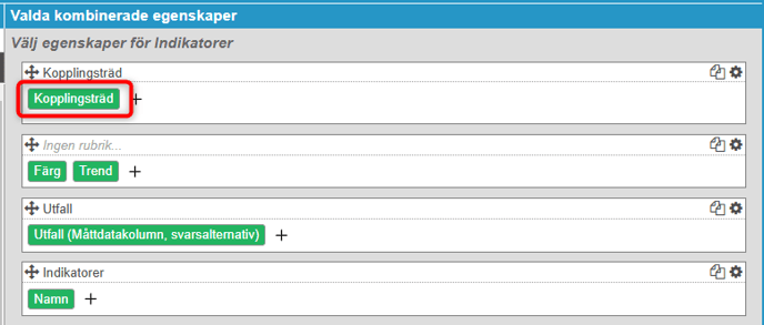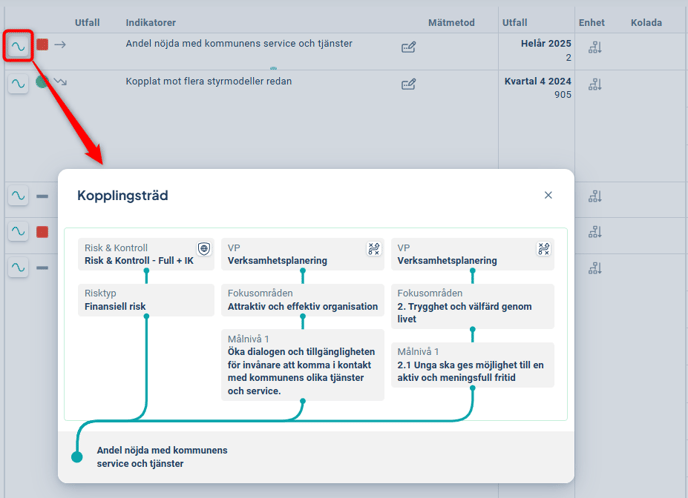 Den första kopplingen sker automatiskt när du skapar ett nytt objekt. I bilden nedan kommer indikatorn kopplas mot det mål som den röda tråden indikerar när du trycker på plus-tecknet för att skapa den: