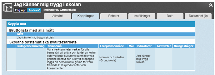 I bilden nedan är Aktiviteterna kopplade mot ett Mål, och målet är kopplat mot ett Läroplansområde. Läroplansområdet är kopplat mot ett Nämndmål, som i sin tur är kopplat mot visionen / styrmodellen självt.