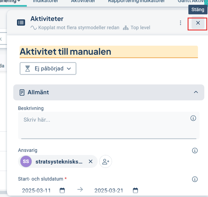 Aktivitetsobjekt är en av de tre objektstyperna i Stratsys och används när man önskar att följa upp något som har ett tydligt definierat start- och slutdatum. Aktiviteter kan löpa under kortare eller längre perioder beroende på typ av aktivitet.