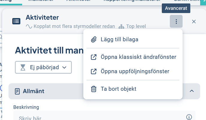 Notera! Aktiviteter kan i våra produkter ha andra namn än just aktiviteter. Andra vanliga namn är åtgärder, direktåtgärder, uppdrag, insats, delaktiviteter, kontrollaktiviteter, delprojekt eller projekt.